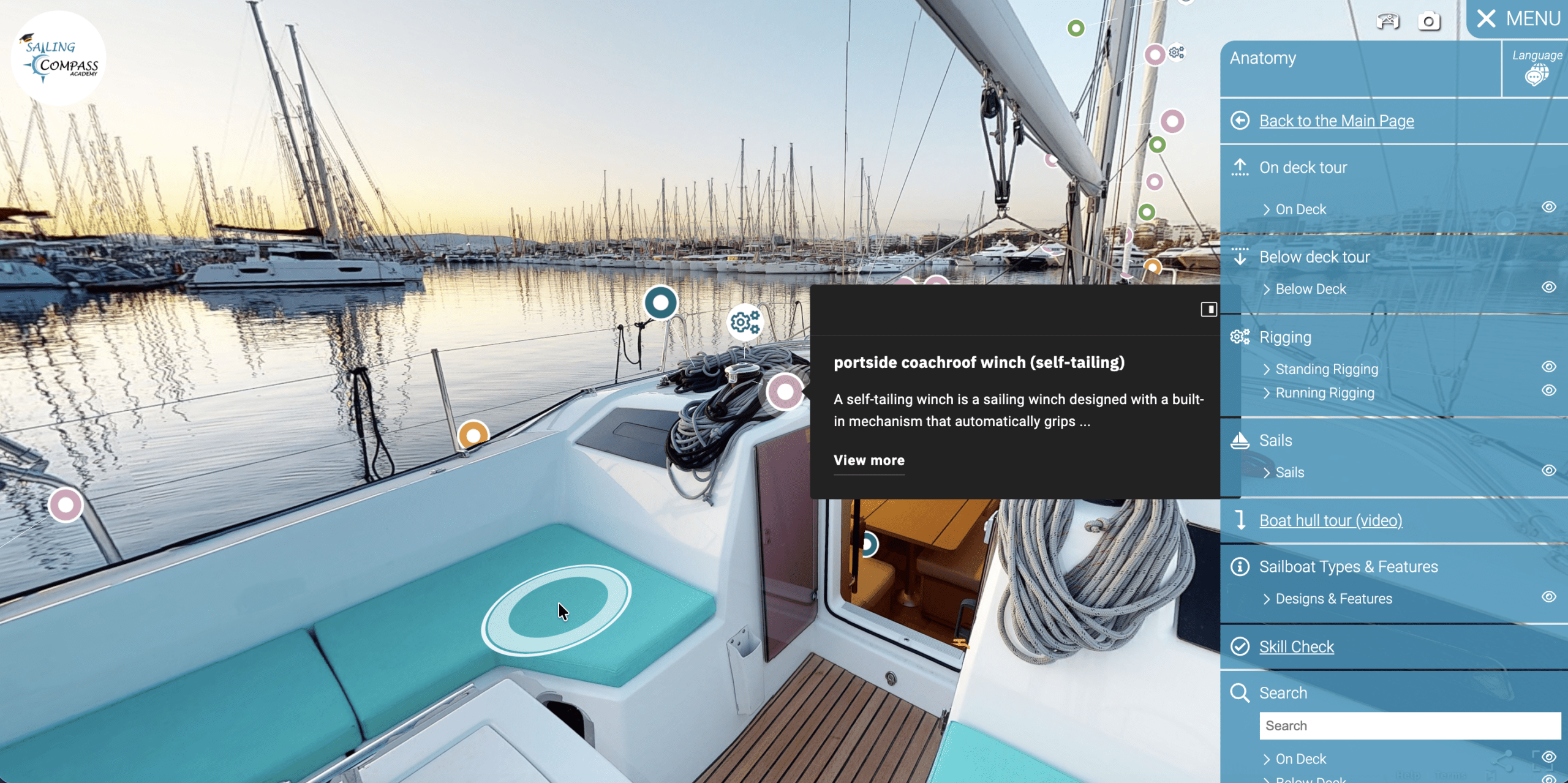On the right side of the screen, you’ll find the main menu for each learning module. This menu connects directly to the 3D sailing boat and guides your experience.
